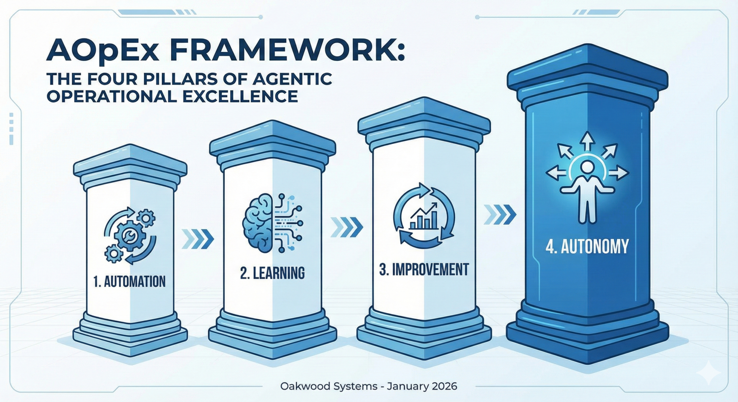 At Oakwood Systems, we have developed a maturity model for AOpEx comprised of four distinct pillars. Organizations must fortify each pillar to move from fragile automation to resilient autonomy.